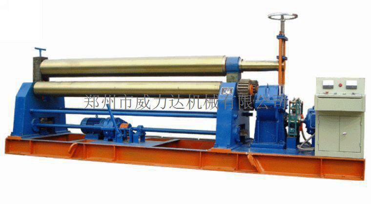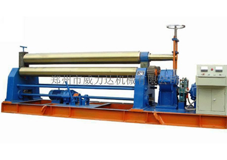 該機為對稱式三輥卷板機,兩下輥為主動固定輥,上輥通過升降絲桿、渦輪、蝸桿在兩下輥對稱中央作上下移動,兩下輥的左、右旋轉和上輥的升降移動均靠電機帶動減速器來完成,并能借助手動離合器把上輥調節成平行或傾斜位置,以適應卷制圓形和錐形工件的需要,渦輪上下配有特種壓力軸承,轉動輕松、省電耐磨。該機集機身、傳動、電器部分為一整體,其結構緊湊、操作方便、便于搬運、安裝和維護。